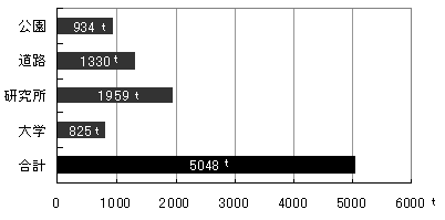 *1 洞峰公園ヒアリング結果より敷地面積比で算出 *2 独立行政法人・森林総合研究所ヒアリング結果より敷地面積比で算出 *3 民間研究所2ヶ所ヒアリング結果より敷地面積比で算出 (具体的な計算方法は付録9−1をご参照ください) 以上の結果と単位トン(t)に直し、グラフ化してみました。