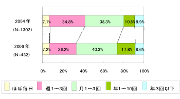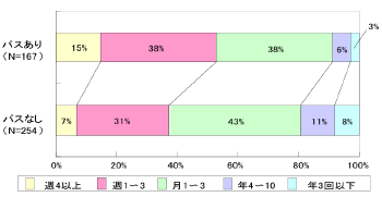 図 9が示す通り、学内バスの利用頻度において、パスカード所有者は非所有者に比べで高頻度を答える割合が非常に高く、特に「毎日」及び「週5回」の回答で大きな差がみられる。