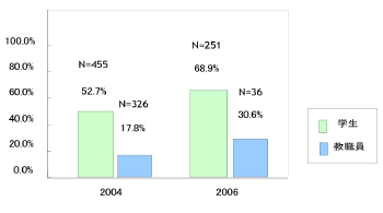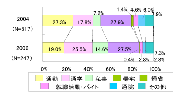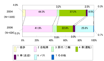 2004年から2006年で自動車選択率が32.7%から22.8%減少し、学内バス選択率が8.5%から25.6%に増加している。