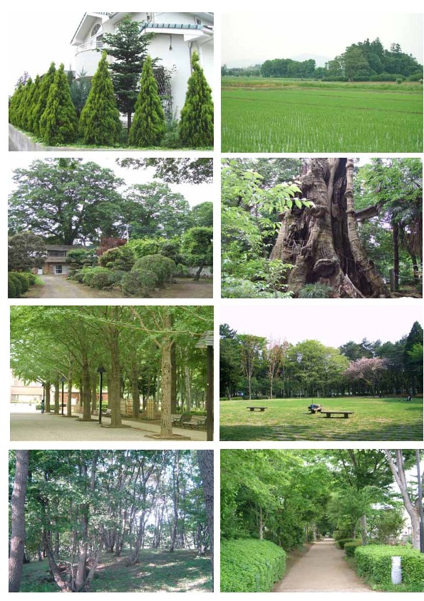 @.つくばにある緑(田園、住宅街の植栽、社寺林、屋敷林、公園、街路樹、緑道、里山)の写真8枚を見せ、その緑の印象を