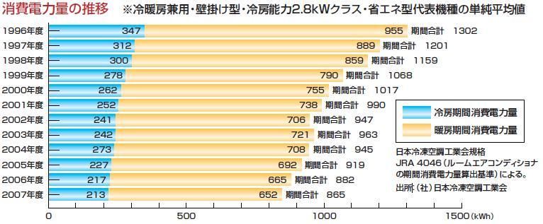 データは日本冷凍空調工業会が示す「壁掛け型冷房能力2.8kW省エネルギー型の代表機種」の物とする。