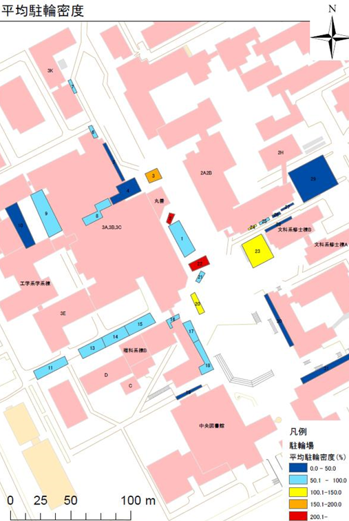 しかし、駐輪場の長さを実測し、駐輪可能台数を求めた場所がある。施設部へのヒアリングにより、幅0.5mで自転車1台分と考えていることが分かった。駐輪可能台数(台)は、