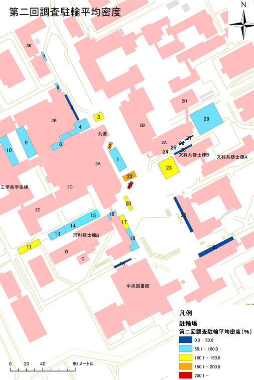駐輪場調査を行い、自転車数の実測を行った。図1にある30か所の駐輪場の駐輪可能台数の総和は2065台である。その後、駐輪場ごとに駐輪率(%)を求めた。