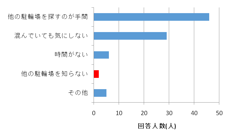 これより、46人もの人が他の駐輪場を探すのは手間がかかるからと回答した。一方で、他の駐輪場を知らないからと回答した人は2人のみだった。