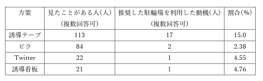 表2は、誘導テープやビラ、誘導看板などで周知を行った駐輪場の2回の調査の変化を表わしている。