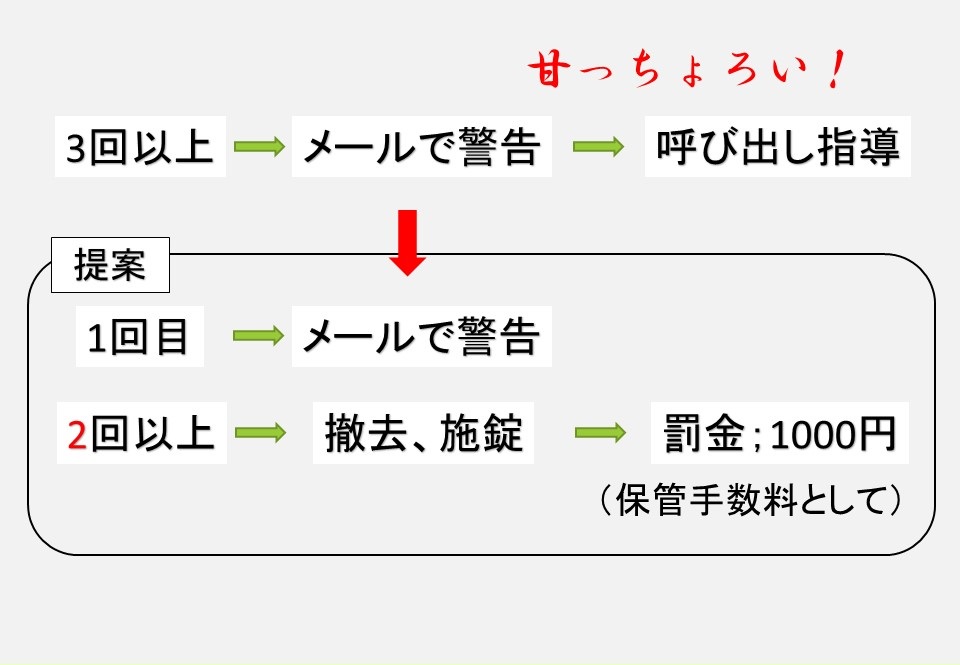 つくば駅の違反駐輪対策に倣い、保管手数料として1000円の罰金を徴収する提案を考える。